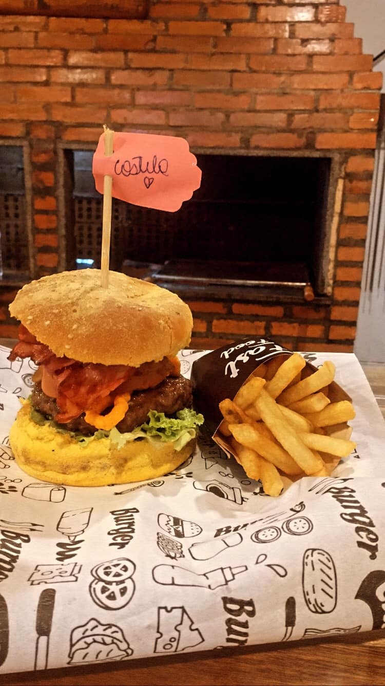 Burguer 150g, Queijo Cheddar, Alface, Tomate, Cebola Roxa, Bacon E 200g Fritas
